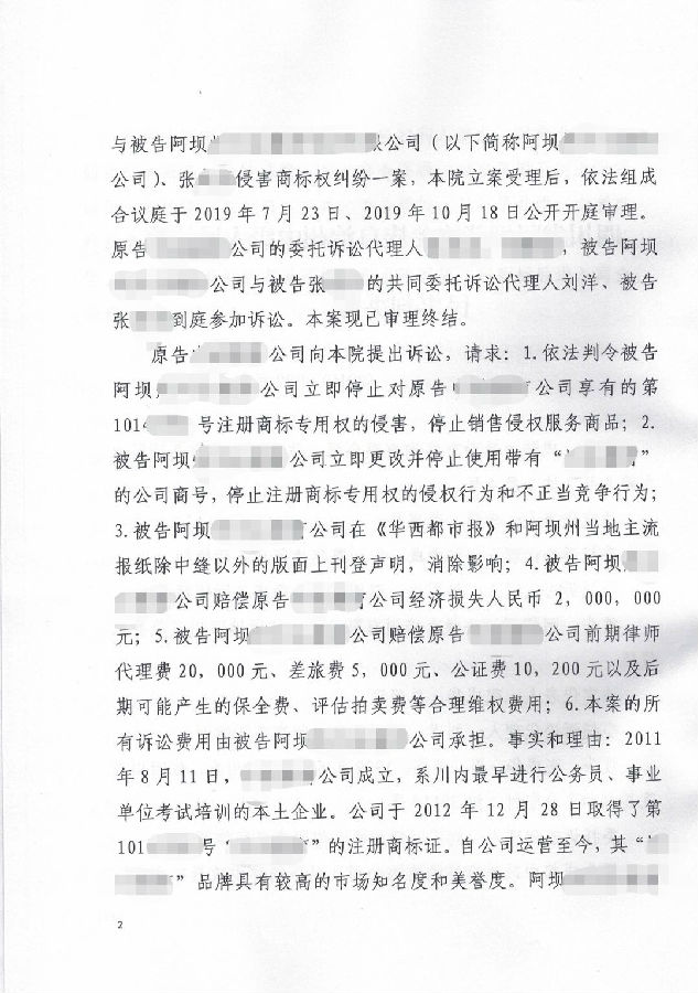 2019年6月,阿坝州某某教育培训公司法定代表人慕名找到四川胡云律师事务所,委托我所代理其与成都某公司侵害商标权纠纷。成都公司起诉我方当事人侵犯商标权,要求我方当事人赔偿对方经济损失2,000,000元,并赔偿成都公司前期律师费20,000元、差旅费5,000元、公证费10,200元以及后期可能产生的其他费用。阿坝公司收到起诉状后急忙委托我所处理该案件。